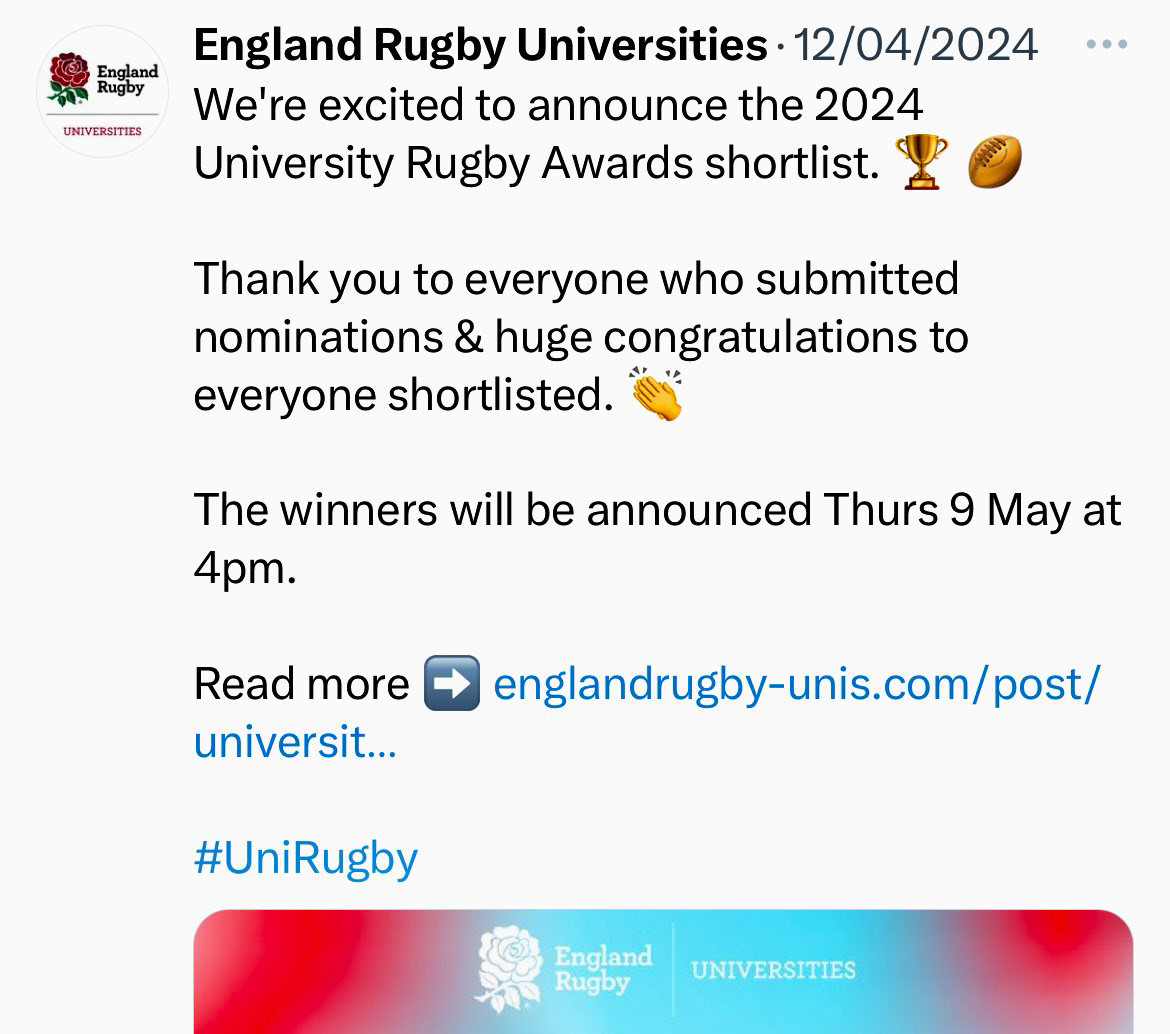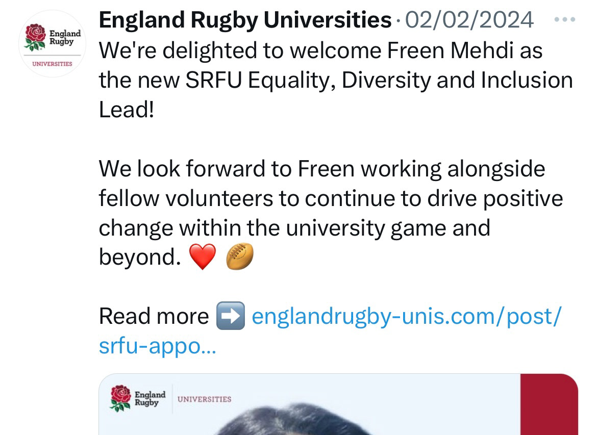 Head of Communications Volunteer for the Students’ RFU (SRFU) (Sept 2023 - Present), a national constituent body of the Rugby Football Union (RFU) representing Higher Education.