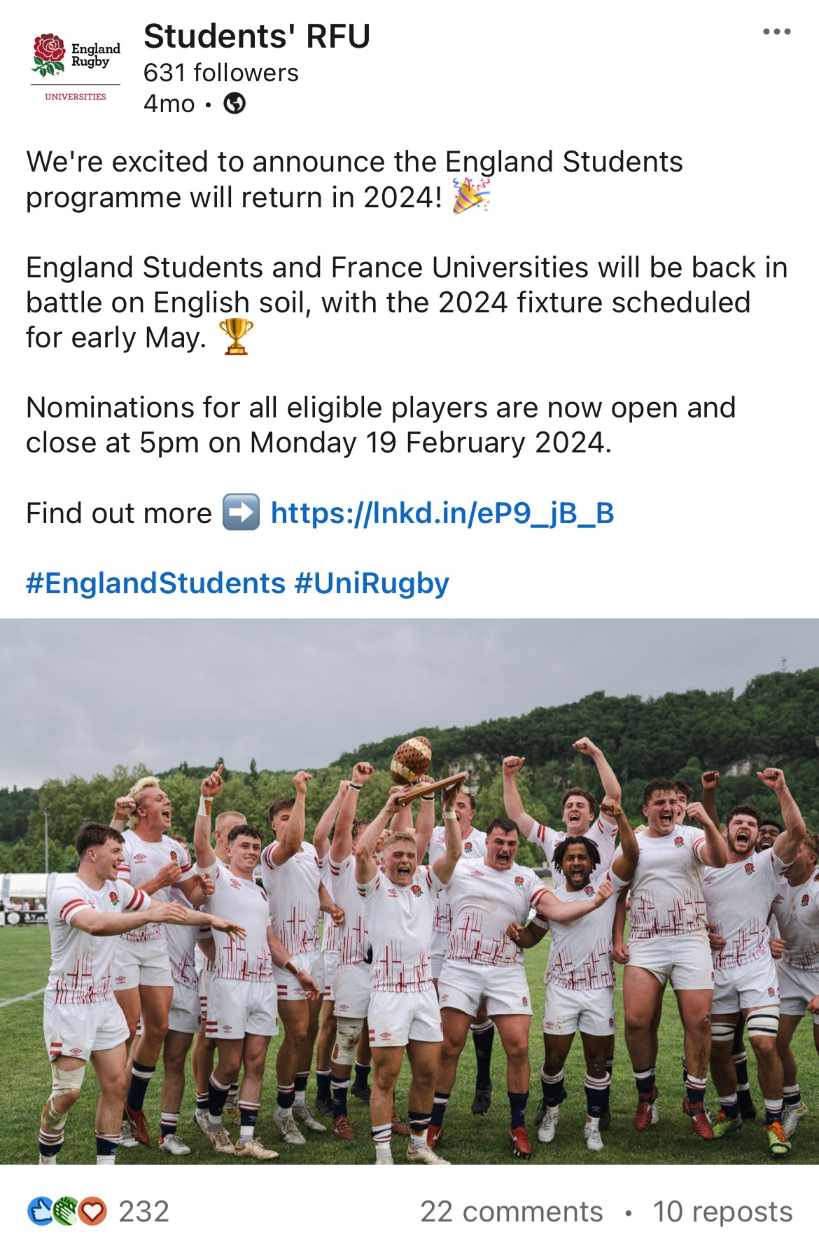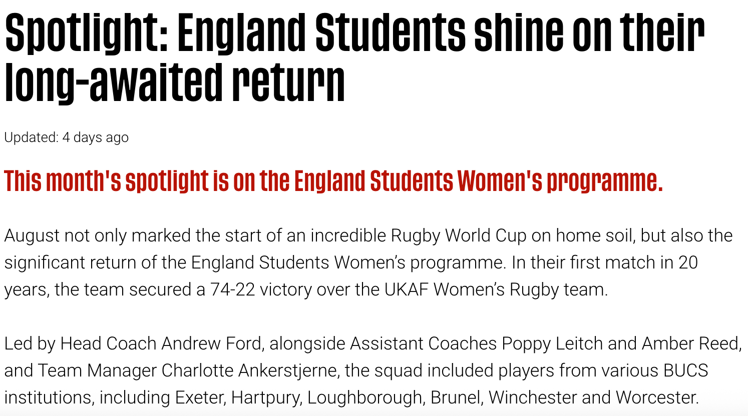 Spotlight piece for England Students Women's programme restarting, article and video: https://www.englandrugby-unis.com/post/spotlight-england-students-shine-on-their-long-awaited-return